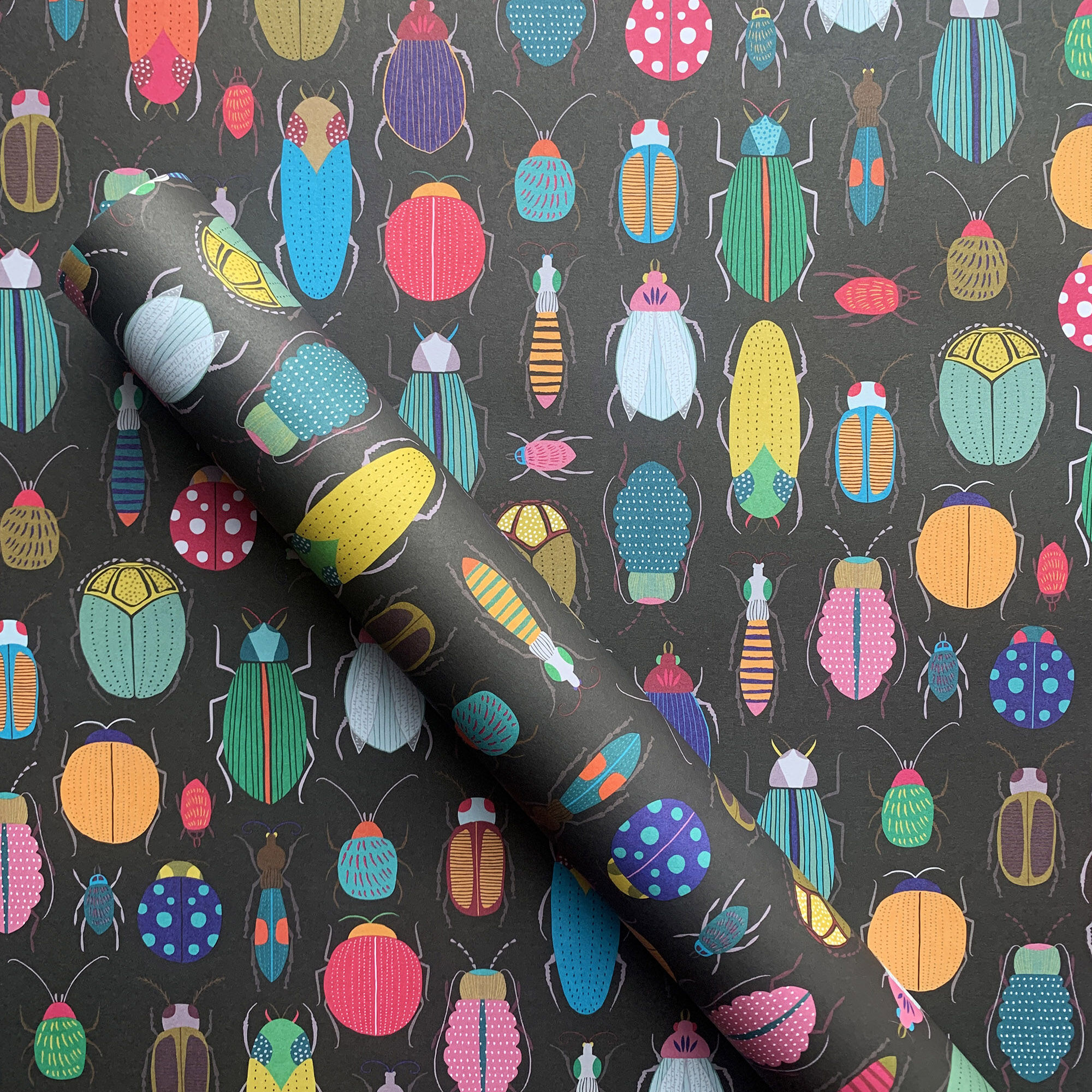 One of my best selling designs dark bugs and beetles is now available on lovely wrapping paper sheets! This design is full of personality in bright happy colours on a black background.