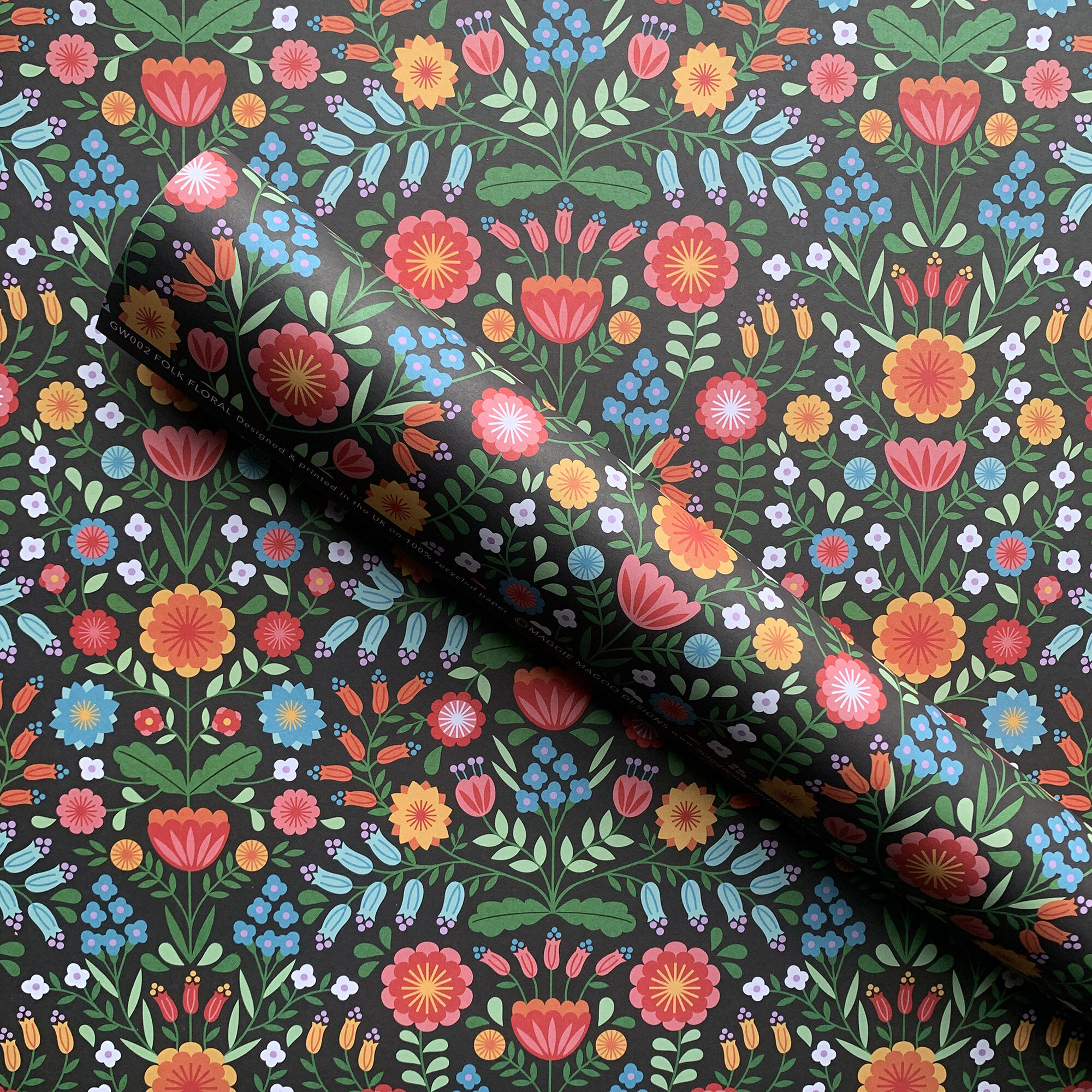 My best selling folk floral design has been added to a wrapping paper sheet. This design is full of personality in vibrant bright colours on a black background. You can also buy it on a tea towel, a Valentine's Day card, a Mum card & the original blank card.