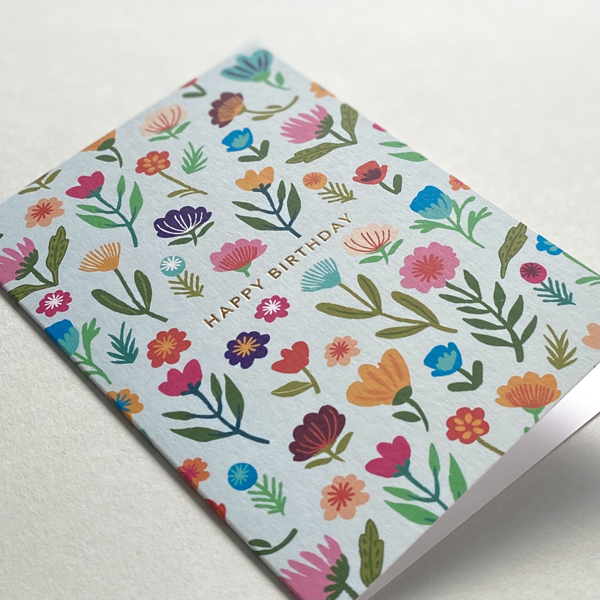 Folk floral design in pretty colours on a minty blue background. Embossed gold foil happy birthday text.