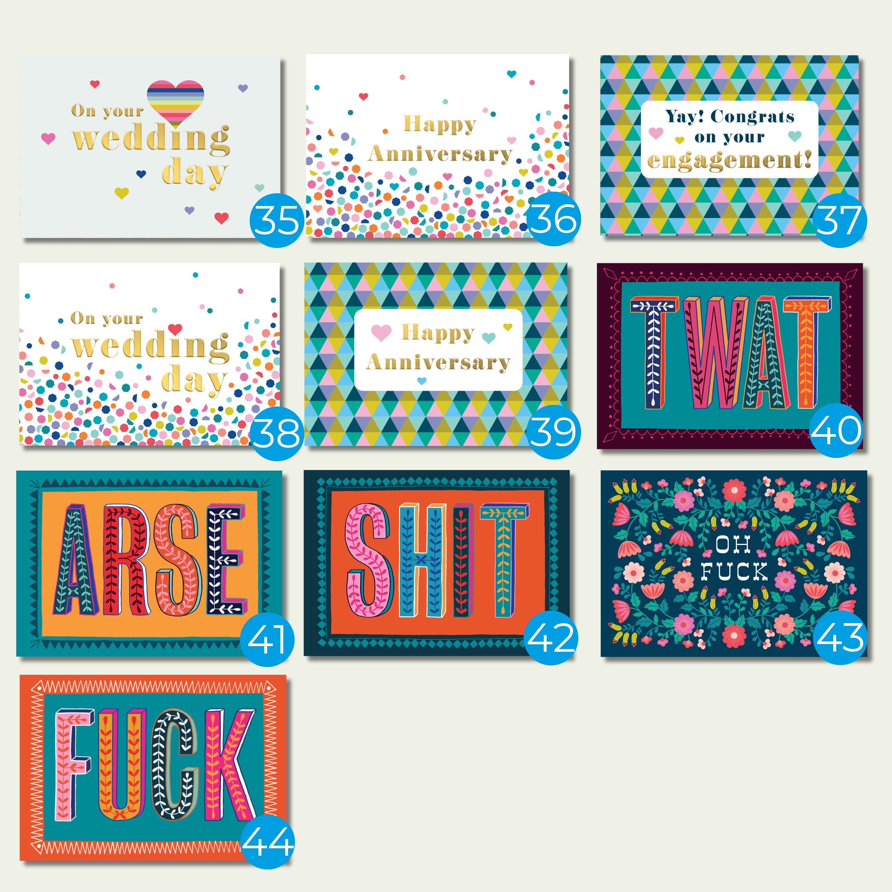 Please see the images on the left to see which designs you would like in your pack and quote the numbers in the note box at checkout. You can choose 10 separate designs or multiples of each.
