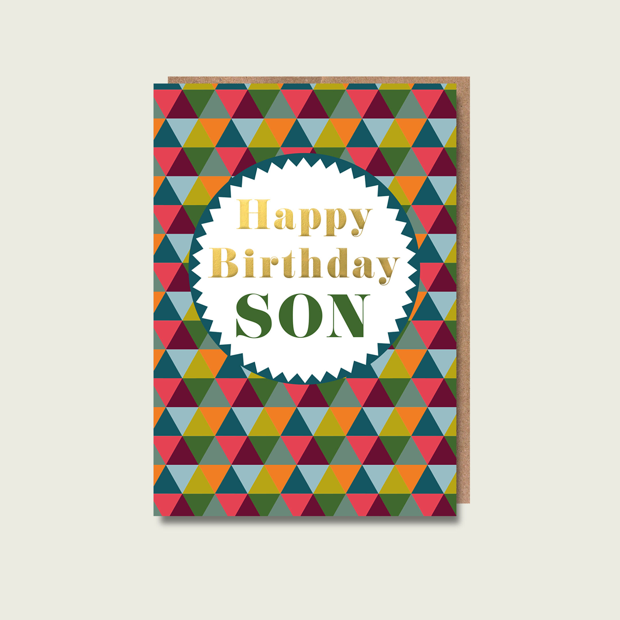 Colourful Son patterned birthday card, with 'Happy Birthday' in gold foil.