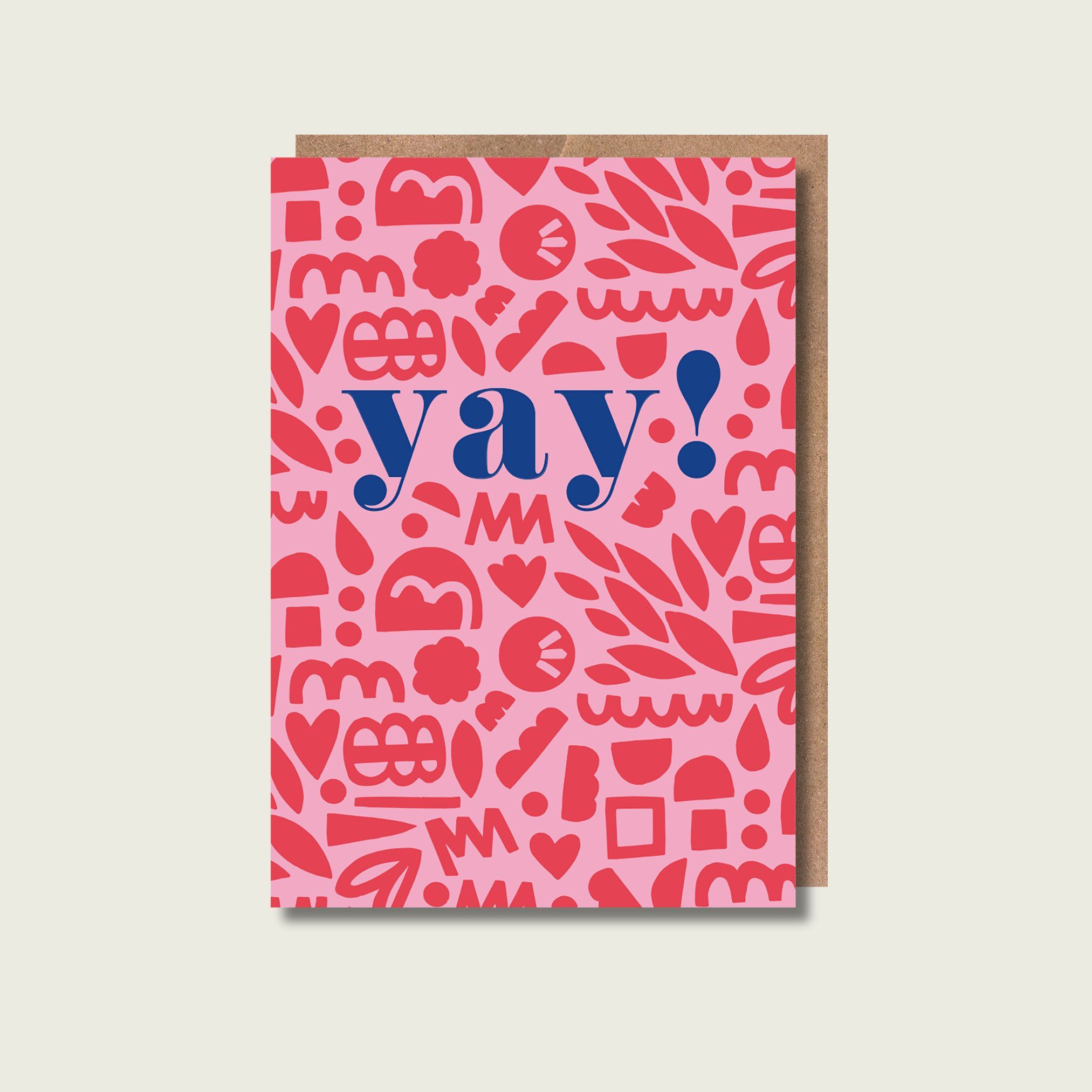 Bright and funky patterned card, saying Yay! Perfect for acknowledging all happy celebrations, for congratulations, and achievements.